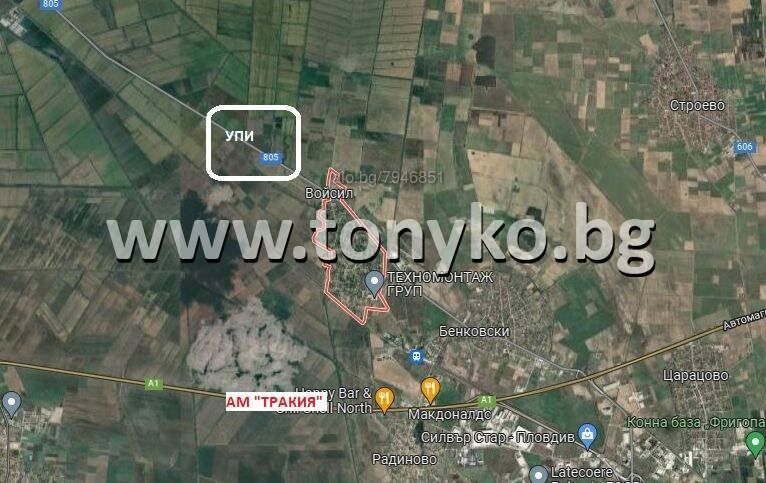 Реф. 621243; ’Тонико имоти’ продава 41,7 дка в РЕГУЛАЦИЯ с лице 360 м на асфалтов път. Имотът е със сменен статут за производствено-складова дейност. Намира се в землището на община Марица, с. Войсил, на 6 километра от АМ ’Тракия’. ТИР достъп. Непосредствено пред имота преминава ел. трасе 20 kV. Теренът се продава и на части: 17 дка с лице 170 м; 8,5 дка с лице 65 м; 16 дка с лице 50 м на цена 18 евро/кв.м. без ДДС. Параметрите на застрояване са: Плътност 60 %, Кинт 2.5. За контакт: Антоанета Ненова