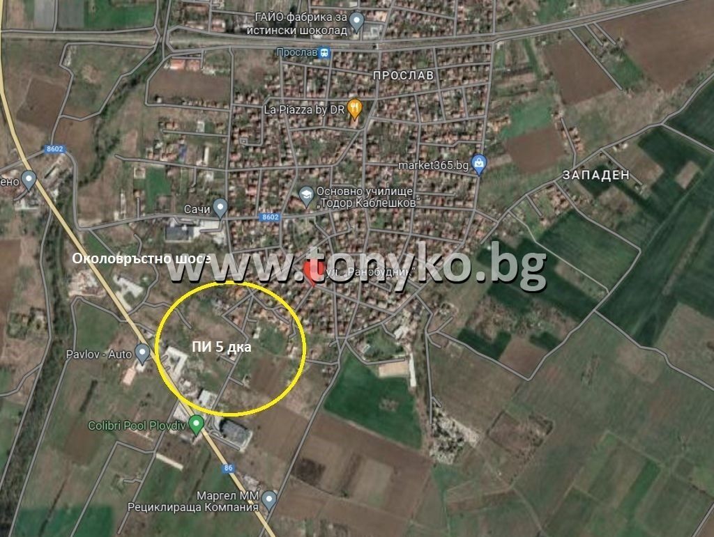 Реф. 631308;"ТОНИКО имоти" продава парцел 5,1 дка в гр. Пловдив, землището на квартал "Прослав". Имотът се намира между последните къщи на квартала и Околовръстно шосе. Има лице към вътрешен път 73 м. Квадратна форма. Лесен достъп от Околовръстно шосе (на 40 м). Съгласно Общия устройствен план на гр. Пловдив (окончателен проект 2022 г.), парцелът попада в устройствена зона "Жм", в която параметрите на застрояване са: Плътност 60 %; Кинт 1,2; Н до 10 м. Започната е процедура по смяна на статут и изработка на ПУП-ПРЗ. За контакт: 0898 613 555 Антоанета Ненова