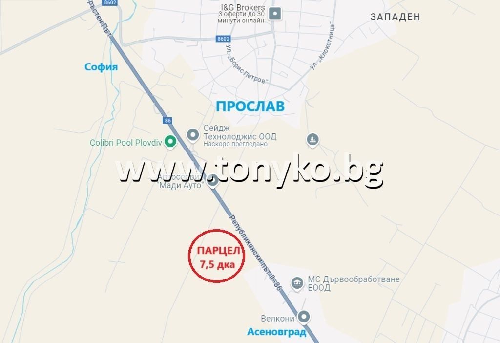 Реф. 631348;"ТОНИКО имоти" предлага за продажба парцел 7,5 дка до Околовръстно шосе в район "Западен", местност "Прослав". Имотът се намира на 350 м южно от металообработващо предприятие "Сейнт технолоджис". Отстои на 15 метра от шосето. Има лице 40 м на общински път. Съгласно Общия устройствен план теренът попада в устройствена зона "СОП" за смесени обществено-обслужващи и производствено-складови дейности с показатели: Кинт до 2.5, Плътност на застрояване до 80 %. За контакти: Антоанета Ненова 0898 613 555