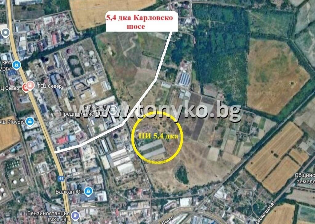 > Реф. 631360; ’Тонико имоти’ предлага за продажба 5,4 дка между ’Свободна безмитна зона’ и Национален сервиз за подемни съоръжения на Карловско шосе. Парцелът има лице 35 м на вътрешен път. По ОУП (Общия устройствен план) на гр. Пловдив, теренът попада в устройствена зона Соп (Смесена обслужващо - производствена зона). Отлично място за строеж на складове, производствени халета, търговски бази и други без жилищно застрояване. Параметрите на застрояване са: Плътност на застрояване от 40 до 60 %; Кинт до 2.5; максимално РЗП 3240 кв.м. За контакт: Антоанета Ненова